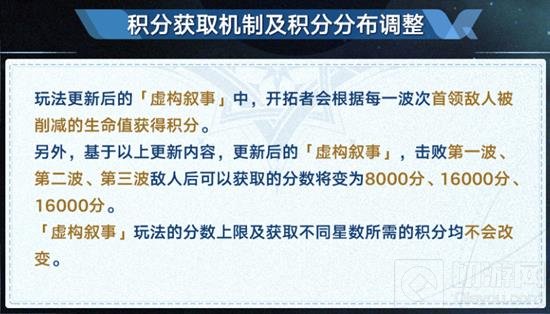 在新版“虚构叙事”中,开拓者会根据每一波次首领敌人被削减的生命值获得积分。另外,在更新后的“虚构叙事”中,击败第一波、第二波、第三波敌人后可获得的分数将分别变为8000分、16000分、32000分。“虚构叙事”玩法的分数上限及获取不同数量所需的积分均不会改变。