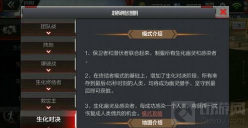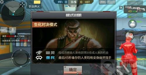 具体玩法如上图所示,那我们再来详细说一下,生化决斗仍然是属于生化模式的玩法,也就是说生化决斗模式他只是在我们现有生化模式内增加了一些趣味的玩法而已,大体的玩法还是和我们平常玩的生化模式基本一样,在生化模式中没有区分什么保卫者和潜伏者只有人类和生化幽灵两大阵营。当你在生化决斗模式游戏中不幸被母体终结者感染后,不要沮丧也不要失落,在这个模式中是可以让你重回人类的,方法就是你再去感染一个人类,感觉是不是有点违背道义?不过玩得开心就好,在这个模式中当游戏在最后45秒的时候人类将会全部变为幽灵猎手与生化幽灵去进行生死决斗。