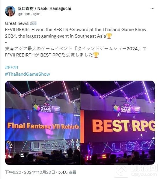 《最终幻想7:重生》的制作人滨口直树也发文庆祝其游戏获得了最佳RPG奖项,他表示:“好消息!《最终幻想7:重生》荣获东南亚最大游戏盛会2024年泰国游戏展最佳RPG奖!”