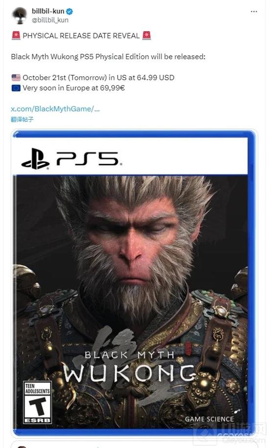 《黑神话:悟空》官方社交媒体宣布,游戏的PS5实体版即将与玩家见面。据知名舅舅党billbil-kun透露,游戏实体版在美国的发售日期为10月21日,售价64.99美元,很快也将在欧洲推出,售价69.99欧元。