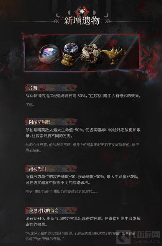本次更新引入了多个新的遗物,如“片瓣”,该物品将使得战斗获得的指挥经验和源石锭减少50%,在特定情况下会产生意想不到的效果。“阿纳萨羯磨”则会增加领袖与精英敌人的最大生命值50%,令战斗更加激烈。“滚动先祖”则为所有敌方单位提供了更快的攻速和移速,并增加了最大生命值30%。“美愿时代的留恋”则会增加源石锭获取,并且在某些节点刷新时有更大的几率出现“得偿所愿”。