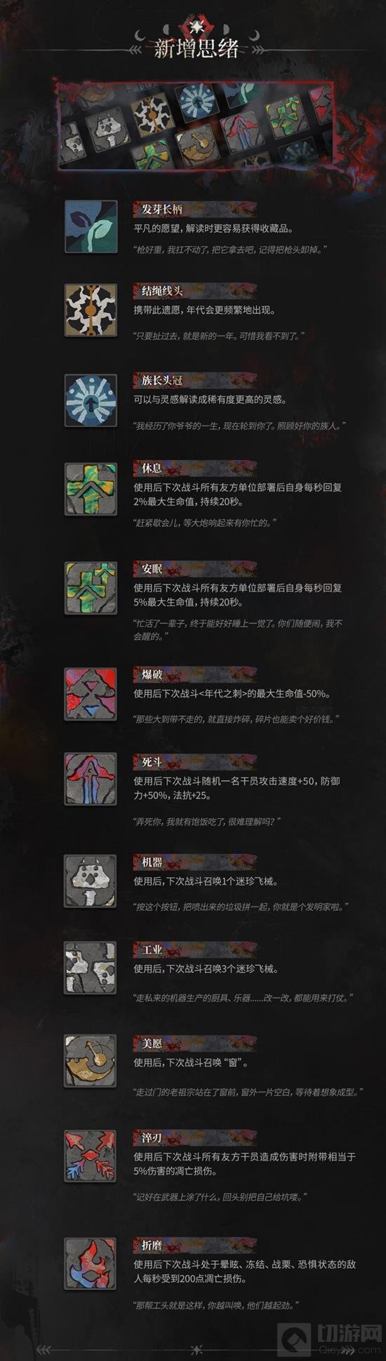 此外,还新增了多种思绪,例如“发芽长柄”,这将帮助玩家更容易获得收藏品;“结绳线头”,增加特定事件的触发频率;“族长头冠”,提供与灵感结合的机会,从而解锁更高稀有度的灵感。