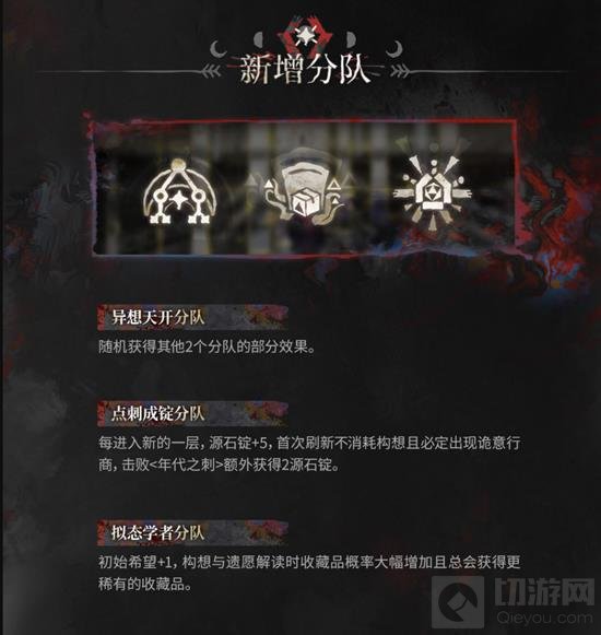 为了配合新内容,游戏中还加入了几个特殊的分队,包括“异想天开分队”,该分队能够随机获得其他两个分队的部分效果;“点刺成锭分队”,在每次进入新的一层时都会增加源石锭的获取量,并在击败特定敌人后获得额外奖励;“拟态学者分队”,初始希望值增加,并且在解读过程中获得收藏品的概率大大提高。
