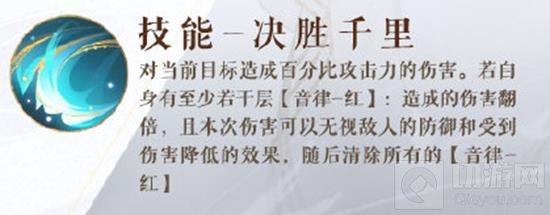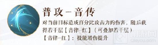 对当前目标造成百分比攻击力的伤害,随后获得若干层【音律-红】(可叠加若干层)【音律-红】:技能增伤提升。