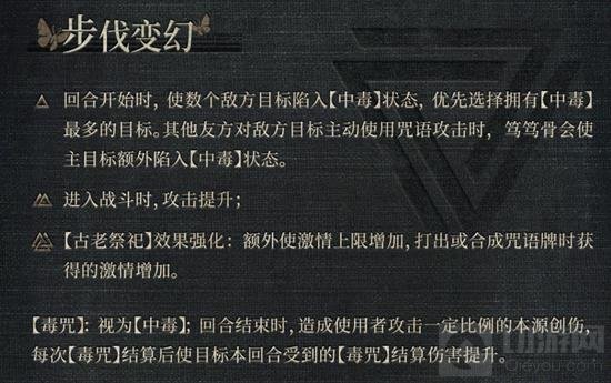 【被动技能】步伐变换:回合开始时使数个敌方目标陷入【中毒】状态;进入战斗时攻击提升。【古老祭祀】效果强化:额外使激情上限增加,打出或合成咒语牌时获益。