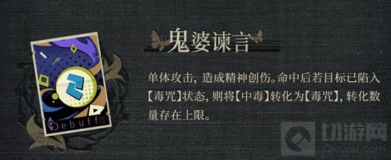 【主动技能】鬼婆谏言:单体攻击,造成精神创伤。命中后若目标已陷入【中毒】状态,则将【中毒】转化为【毒咒】。