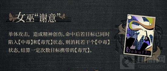【主动技能】女巫“谢意”:单体攻击,造成精神创伤。命中后若目标同时陷入【中毒】和【毒咒】状态,消耗若干个【中毒】状态,结算一定次数携带的【毒咒】。