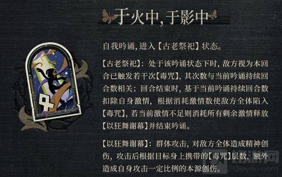 【主动技能】于火中,于影中:自我吟诵,进入【古老祭祀】状态。在该状态下,敌方视为本回合计触发若干次【毒咒】,根据持续回合计数扣除自身激情,对敌方全体造成伤害。