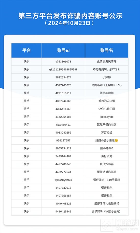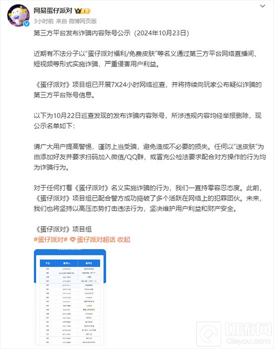 今日(10月23日),《蛋仔派对》项目组发布公告揭露了新一批通过第三方平台进行诈骗的账号。这些不法分子利用“福利发放”和“免费皮肤”等诱饵,通过直播间和短视频等渠道诱骗用户,严重损害了玩家的利益。