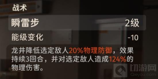 战术【瞬雷步】:解锁中级认证后,能级变化为+0。先降低防御,再造成伤害,能吃到减防带来的伤害加成。多次使用可继续降低敌人防御力。