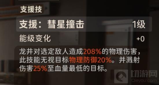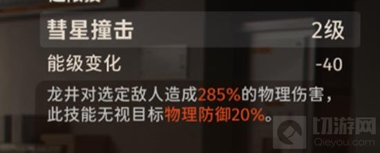 超限技【彗星撞击】:一个可以无视20%防御力的单体输出技能,也是龙井的主要输出技能。伤害很高,是主要的伤害输出来源。