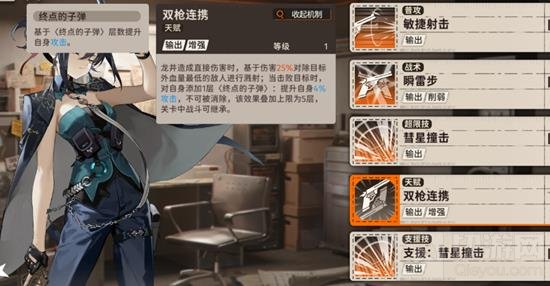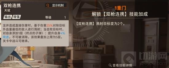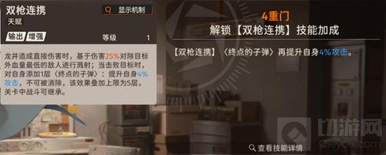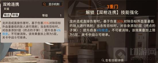 天赋技能【双枪连携】:龙井造成直接伤害的25%(30%为三重门效果)会对除目标以外的血量最低的敌人进行溅射伤害。击败敌人时,给自己添加一层攻击加成BUFF,溅射伤害击败敌人也会给自己增加攻击力BUFF。溅射伤害是基于对选定目标造成的伤害量计算的,不受溅射敌人的防御属性影响。
