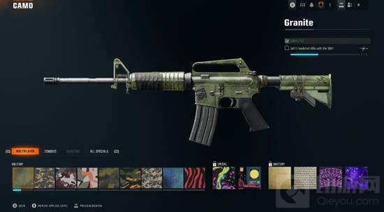每种武器都必须单独解锁军用迷彩。例如,如果您已经解锁了AMES 85的第一个多人军用迷彩(花岗岩),则可以在所有模式下将其装备到AMES 85上,但不能将其装备到任何其他武器上,直到您单独解锁花岗岩迷彩使用该武器。