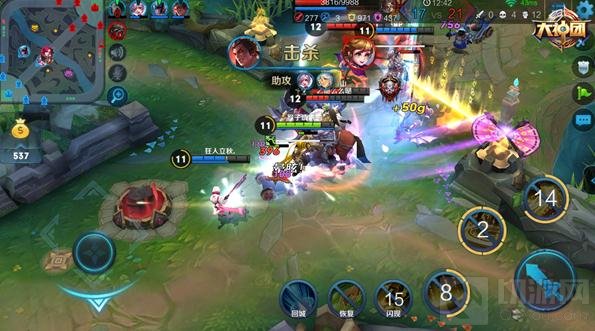 鲁班在后排不断通过普攻输出,并且释放1、2技能群攻敌人,同时用大招收割人头,让敌人前排敌人的血量不断被效果。