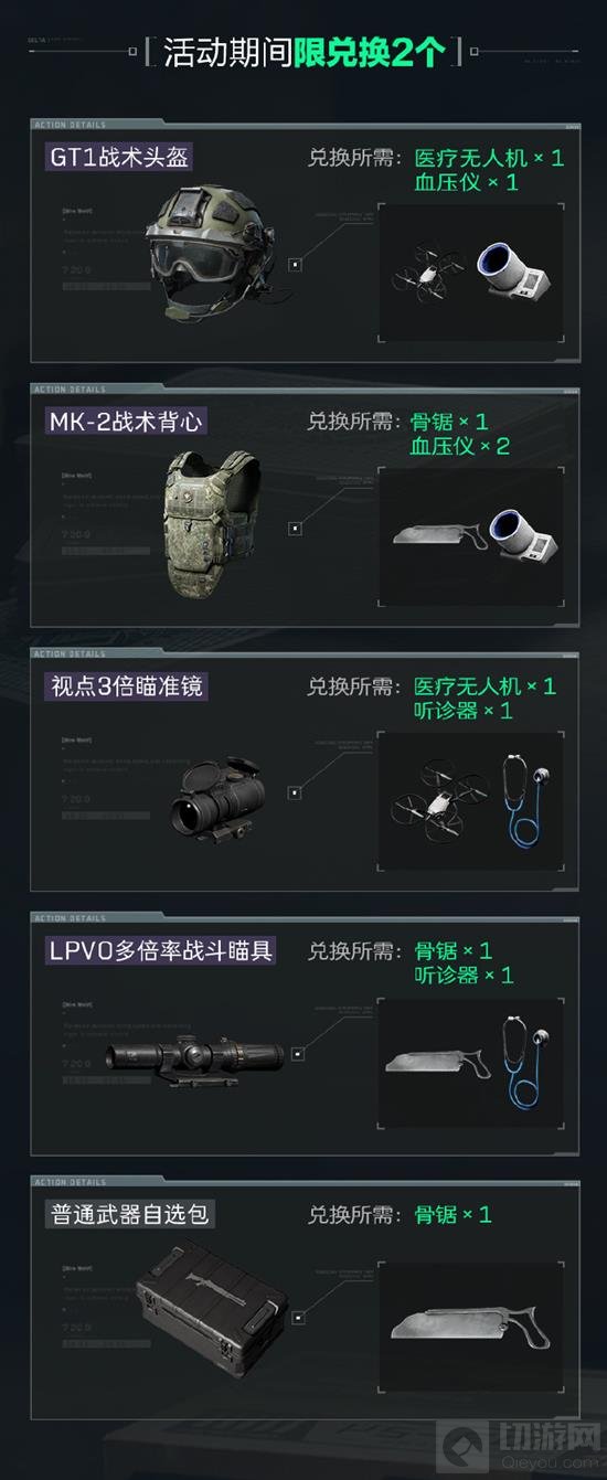 活动期间,每位干员都有机会通过努力收集医疗物资,兑换包括GT1战术头盔、MK-2战术背心、视点3倍瞄准镜、LPVO多倍率战斗瞄具、普通武器自选包、MC201头盔、射手战术背心以及3级子弹自选包在内的多种高级装备。