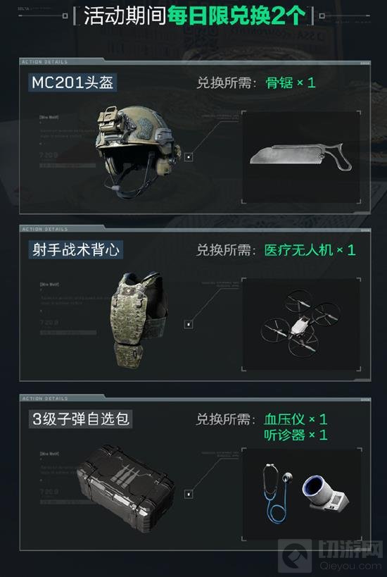 值得注意的是,整个活动期间每位干员仅限兑换两种装备,且每天限制兑换两次,每一次兑换都需要消耗对应的医疗物资。具体来说,GT1战术头盔需要医疗无人机一台和血压仪一个,MK-2战术背心则需要骨锯一把和血压仪两台,视点3倍瞄准镜需要医疗无人机一台和听诊器一个,LPVO多倍率战斗瞄具同样需要骨锯一把和听诊器一个,普通武器自选包只需骨锯一把即可,MC201头盔也需要骨锯一把,射手战术背心则需要医疗无人机一台,而3级子弹自选包则需要血压仪一个和听诊器一个。