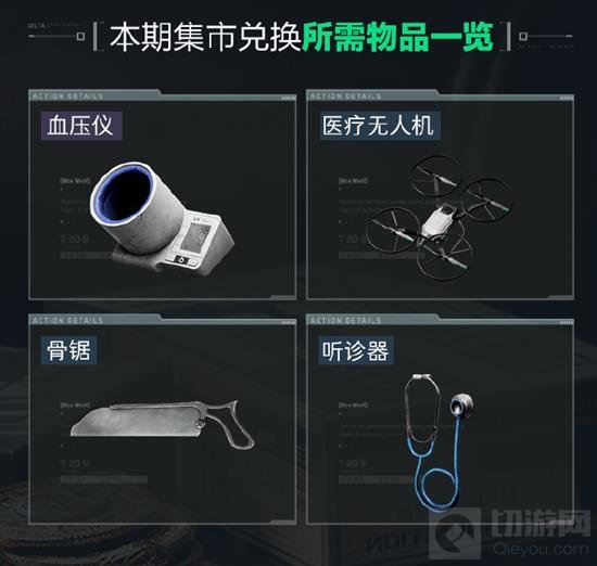 为了让干员们更好地准备这场活动,游戏官方特地展示了本次活动所需的四种主要医疗物资——血压仪、医疗无人机、骨锯和听诊器。它们长下面这样: