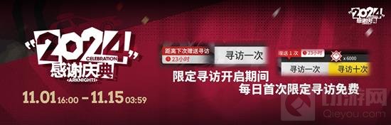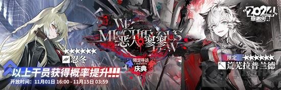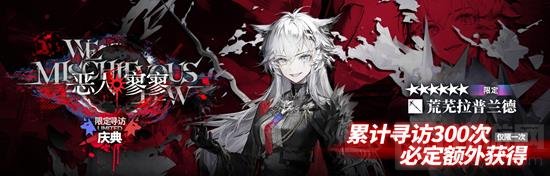 从11月01日至11月15日,【限定寻访·庆典】-「恶人寥寥」将开放,期间特定干员出现率提升。其中包括限定干员【荒芜拉普兰德】以及其他高星级干员。限定时间内累计寻访300次,可额外获得限定干员【荒芜拉普兰德】一次。