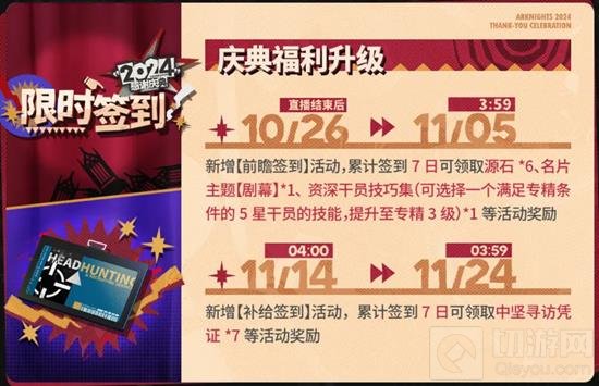 10月26日-11月5日期间,累计签到7天可领取源石*6、名片主题“剧幕”*1、资深干员技巧集(可选择一个满足专精条件的五星干员技能,提升至专精3级)*1等丰厚奖励。