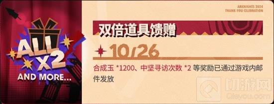 10月26日感谢庆典直播当天,合成玉1200、中坚寻访次数2等超值奖励,已通过游戏内邮件发放。