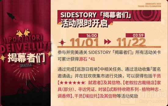 11月1日-11月22日,参与并完美通关SIDE STORY“揭幕者们”所有活动关卡,可累计获得源石*41。通过完成相关任务、收集匿名邀请函并在狂欢夜集市兑换,还可以获得包括干员【★★★★★:弑君者】及其信物、【老叙拉古裁缝店】家具(部分)、寻访凭证、时装【忒斯特收藏系列-植物种志-调香师】、干员【埃拉托】及其信物等丰厚奖励。