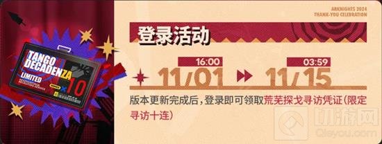 11月1日-11月15日,版本更新完成后,登录即可领取荒芜探戈寻访凭证(限定寻访十连)。