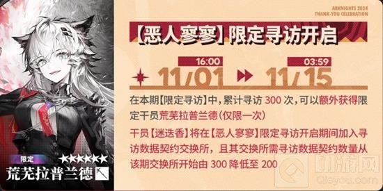 11月1日-11月15日,在本期限定寻访中,累计寻访300次,可以额外获得限定干员【荒芜拉普兰德】。干员【迷迭香】将在限定寻访开启期间加入寻访数据契约交换所,且其交换所需寻访数据契约数量从300降低至200。