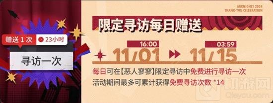 11月1日-11月15日,每日可在限定寻访中免费进行寻访一次,活动期间最多可累计获得免费寻访次数*14。
