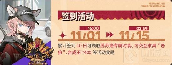 11月1日-11月15日,累计签到10天可领取苏苏洛专属时装、可交互家具“恶狼”、合成玉*400等实用奖励。