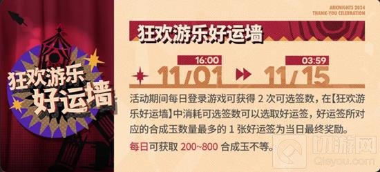 11月1日-11月15日,活动期间每日登录游戏可获得2次可选签数,在狂欢游乐好运墙中消耗可选签数可以选取好运签,好运签所对应的合成玉数量最多的1张好运签为当日最终奖励。每日可获取200~800合成玉不等。