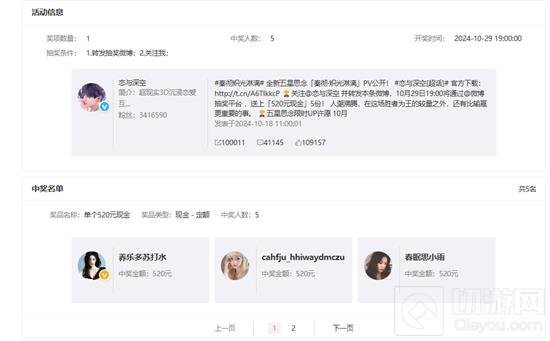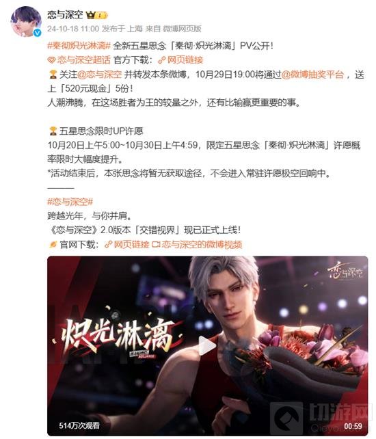 10月18日11:00,《恋与深空》官方微博发布微博,宣布全新五星思念「秦彻·炽光淋漓」PV公开,并提到了关注并转发微博的抽奖活动,将在10月29日19:00通过微博抽奖平台,抽取5名用户平分2600元现金,即每人获得520元现金。