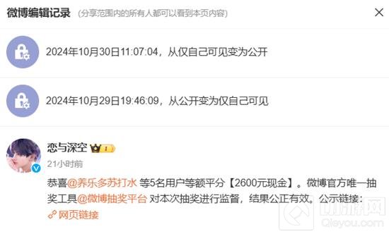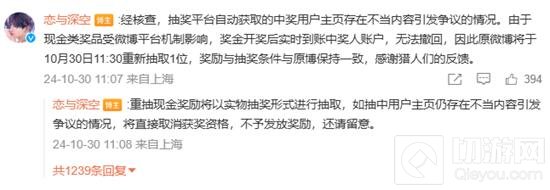 10月30日11:07,恋与深空游戏官方重新公开该微博,并在原微博下发布回复,说明由于中奖用户主页存在不当内容,但而之前的中奖用户,由于现金类奖品受微博平台机制影响,奖金开奖后实时到账中奖人账户,无法撤回。因此官方决定将于当天11:30重新抽取1位中奖者,奖励与原抽奖条件保持一致。