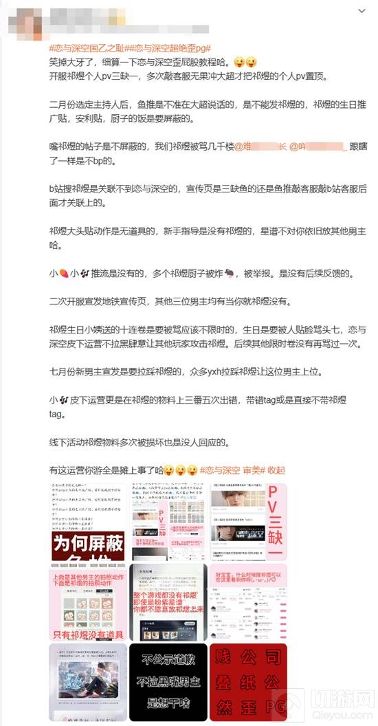 另外也有博主收集了相关信息,指出从恋与深空开服起,官方对角色祁煜的待遇就不公,具体有开服四名男主只有祁煜没有角色PV、超话社区的祁煜相关厨力放出不被允许发布、和祁煜游戏内双人拍照动作没有手持道具的选项、搜四位男主的角色名,在平台只有搜索祁煜时不会链接到官号等,可见积怨已久也是此次事件闹得如此大的原因。