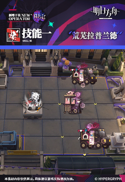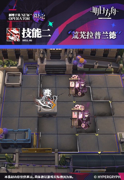 技能开启后,荒芜拉普兰德的浮游单元增加2个,攻击力提升。释放特殊形态的浮游单元,散开后在整个战场范围各自追逐较近的敌人,追上时使目标恐惧数秒并锁定其攻击。浮游单元周围的敌人移动速度下降且每秒受到一定法术伤害。锁定目标倒下后,浮游单元会重新索敌,直至技能结束后返回干员身边。