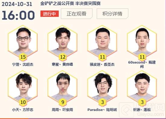 北京时间2024年10月31日,金铲铲JOC6全国总决赛半决赛突围赛,本组选手:骚皮迷、60second、Paradise、寒星、祈愿、小天、宁理、周周。