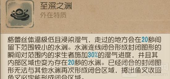 水渊:分为未闭合和已闭合两种状态,未闭合的水渊呈浅白色,已闭合的水渊边界和内部都呈浅蓝色。两种水渊都能为求生者叠加湿气。