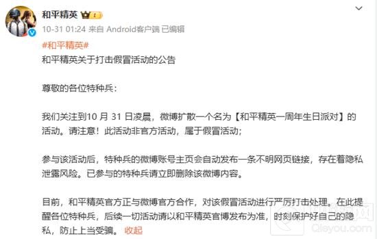 我们关注到10月31日凌晨,微博扩散一个名为【和平精英一周年生日派对】的活动。请注意!此活动非官方活动,属于假冒活动;