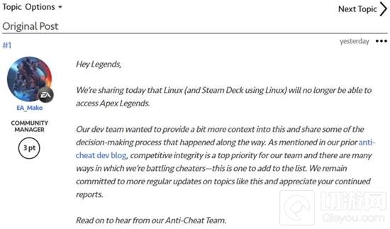 EA和Respawn Entertainment的这一决定是为了维护游戏的“竞技完整性”和打击作弊行为。虽然这将影响到一小部分使用Linux系统的玩家,但EA相信这一决定将显著减少游戏中的作弊行为。对于Steam Deck用户来说,如果他们能够安装Windows系统,他们仍然可以继续在设备上玩游戏。这一决策体现了EA和Respawn在保护游戏环境和提升玩家体验方面的坚定立场。
