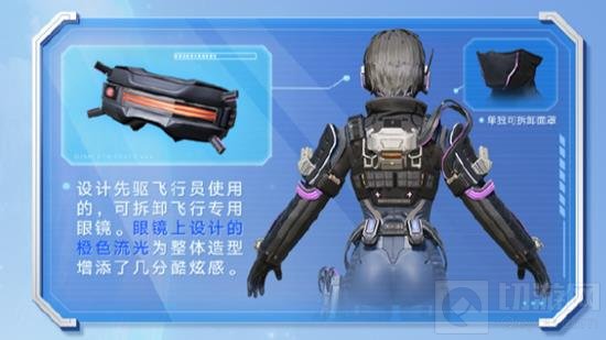 设计先驱飞行员使用的,可拆卸飞行专用眼镜。眼镜上设计的橙色流光为整体造型增添了几分酷炫感。