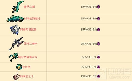 武器:至少会掉以下七种武器之一,包括翡翠之潮、利维坦海潮枪等,掉率25%/33.3%Boss属性。