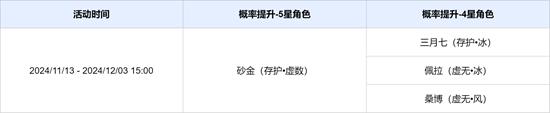 活动期间,限定5星角色「砂金(存护•虚数)」,4星角色「三月七(存护•冰)」「佩拉(虚无•冰)」「桑博(虚无•风)」跃迁成功概率限时提升。