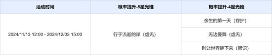 活动期间,限定5星光锥「行于流逝的岸(虚无)」,4星光锥「余生的第一天(存护)」「无边曼舞(虚无)」「别让世界静下来(智识)」跃迁成功概率限时提升。