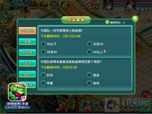 为迎接奥运会,《梦想世界》手游特别推出奥运竞猜活动,奥运竞猜活动开启期间,玩家们每周获得活跃度的同时将获得对应数值的竞猜积分,共有多个不同的奥运题目供侠士们通过积分下注竞猜,正确猜中相应的题目将获得双倍的下注积分奖励,活动期间竞猜积分能兑换丰厚的奖励。