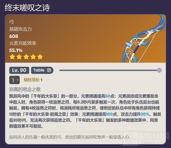 终末嗟叹之诗是一把五星武器,其特点是带有很高的辅助能力,且可以大幅提高欧洛伦的元素充能效率,被动效果通过元素战技、元素爆发攻击敌人,来为队友提供元素精通和攻击力加成。