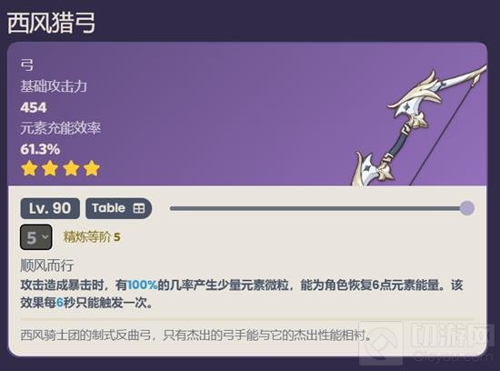 西风猎弓是一把获得容易较低的四星武器,副词条是充能效率,提升欧洛伦的续航能力。西风猎弓的触发方式简单,只需造成暴击伤害即可获得元素微粒,可以同时解决自己和队友的充能问题。