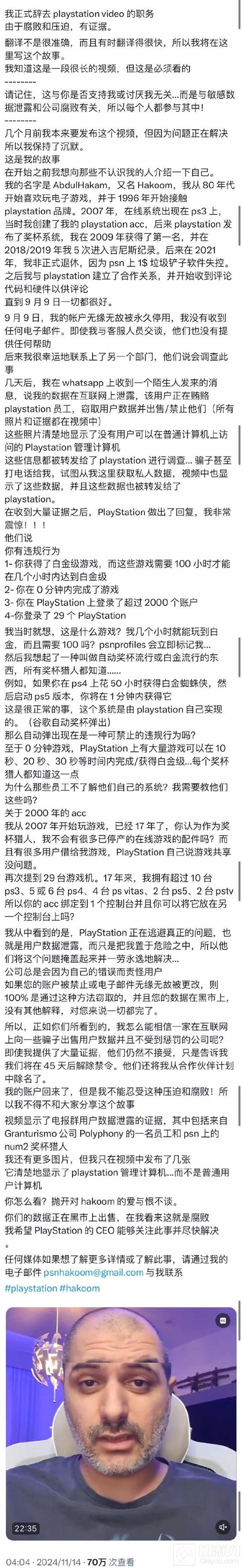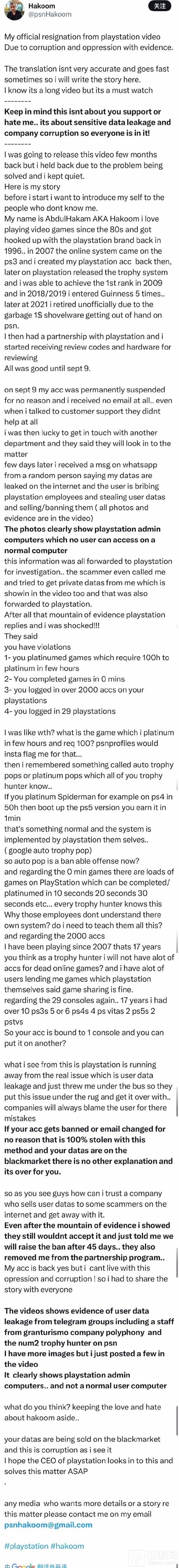 Hakoom对PlayStation的处理方式表示不满,认为PlayStation在逃避数据泄露问题,他决定分享自己的故事以揭露PlayStation的腐败行为。