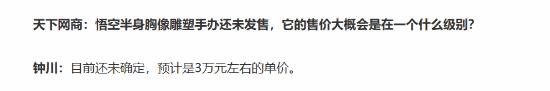 今年10月份,在上海新国际博览中心举办的WF2024展会上,可动手办品牌INART展出了《黑神话:悟空》的官方授权雕像及其他衍生物品,引起了广泛关注。这些雕像因其精致的工艺而备受玩家好评,许多人猜测其售价可能非常高昂。近日,守川文化创始人钟川在接受天下网商采访时透露,展出的《黑神话:悟空》天命人雕像的价格预计在3万元左右,但具体价格尚未最终确定。