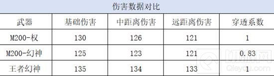 在威力方面,M200-权在基础伤害方面大于M200-幻神,与王者幻神持平,且在中距离伤害与穿透方面也是优于幻神,M200-权同样拥有双穿与满穿,属于是幻神的一个简单加强款,但是保留了M200系列武器无法打腿一枪死的设定,毕竟这是王幻特性,还是做到了一定程度的平衡,以下即为其伤害与穿透对比。