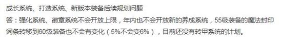 策划回答:强化系统、徽章系统不会开放上限,年内也不会开放新的养成系统,55级装备的魔法封印词条转移到60级装备也不会有变化(5%不会变6%),目前还没有转甲系统的计划。