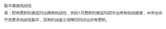 策划回答:即将更新的奥兹玛也拥有挑战性,例如1月更新的奥兹玛团本也将有挑战难度,未来也会开发更多挑战性副本,现有的迷惘之塔等旧玩法也会有更新。